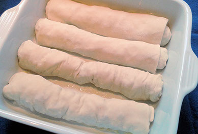 Eingerollte Strudel in eine gefettene Pfanne geben und ab in den Ofen